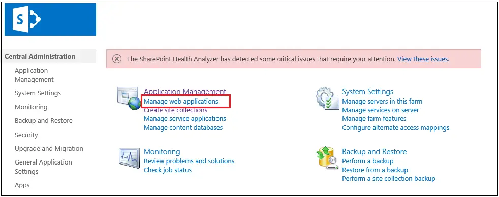 - Go to Central Administration >> Application Management >> Manage web applications