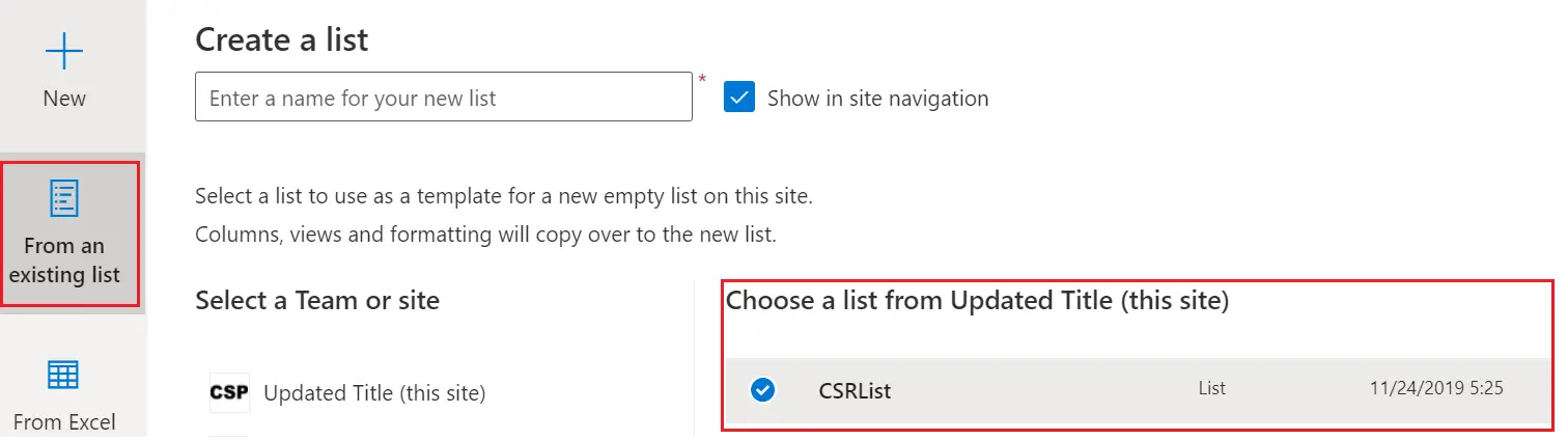 - From and Existing list: Using this option you can create a list using an existing list that is there on the site or all the subsites of the current site. Formatting, Views, Schema, columns, everything except data will be copied over into the new list.